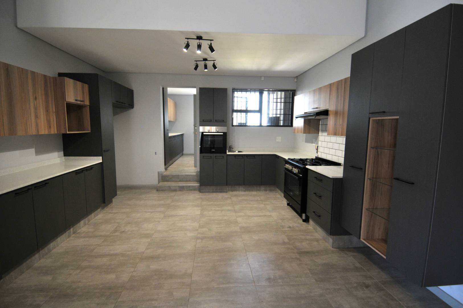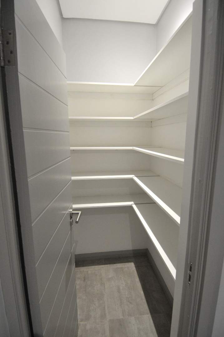 The modern kitchen boasts gas cooking, sleek finishes, and a separate scullery with space for two under-counter appliances. A pantry/linen cupboard offers additional storage, keeping your space clutter-free and functional.