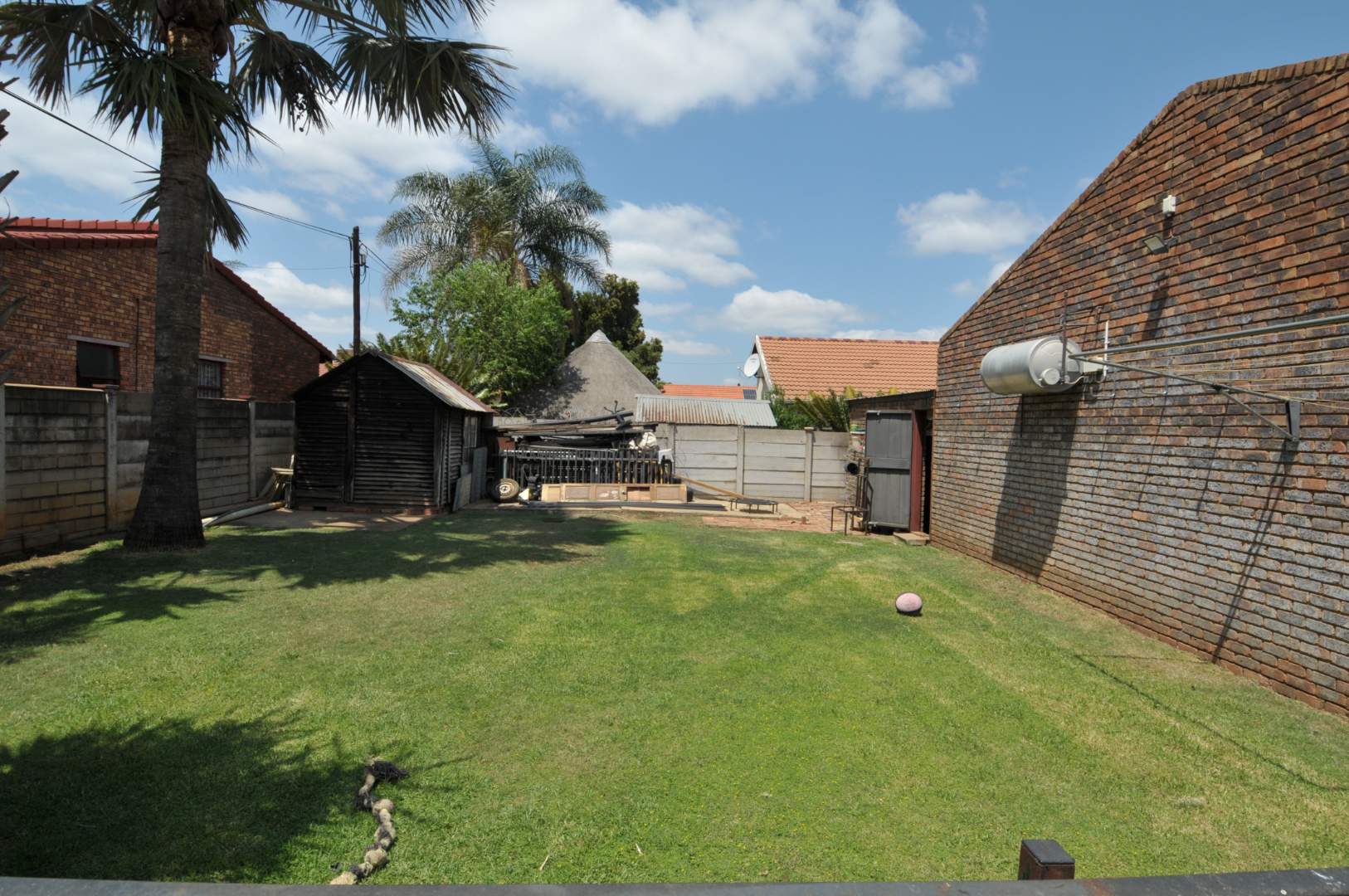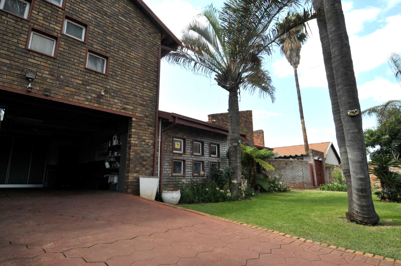 Safety is a top priority with security cameras, a full alarm system, and outdoor lighting that surrounds the yard. A borehole-fed irrigation system keeps the wrap-around garden lush and green, which also features a garden shed for added storage.
