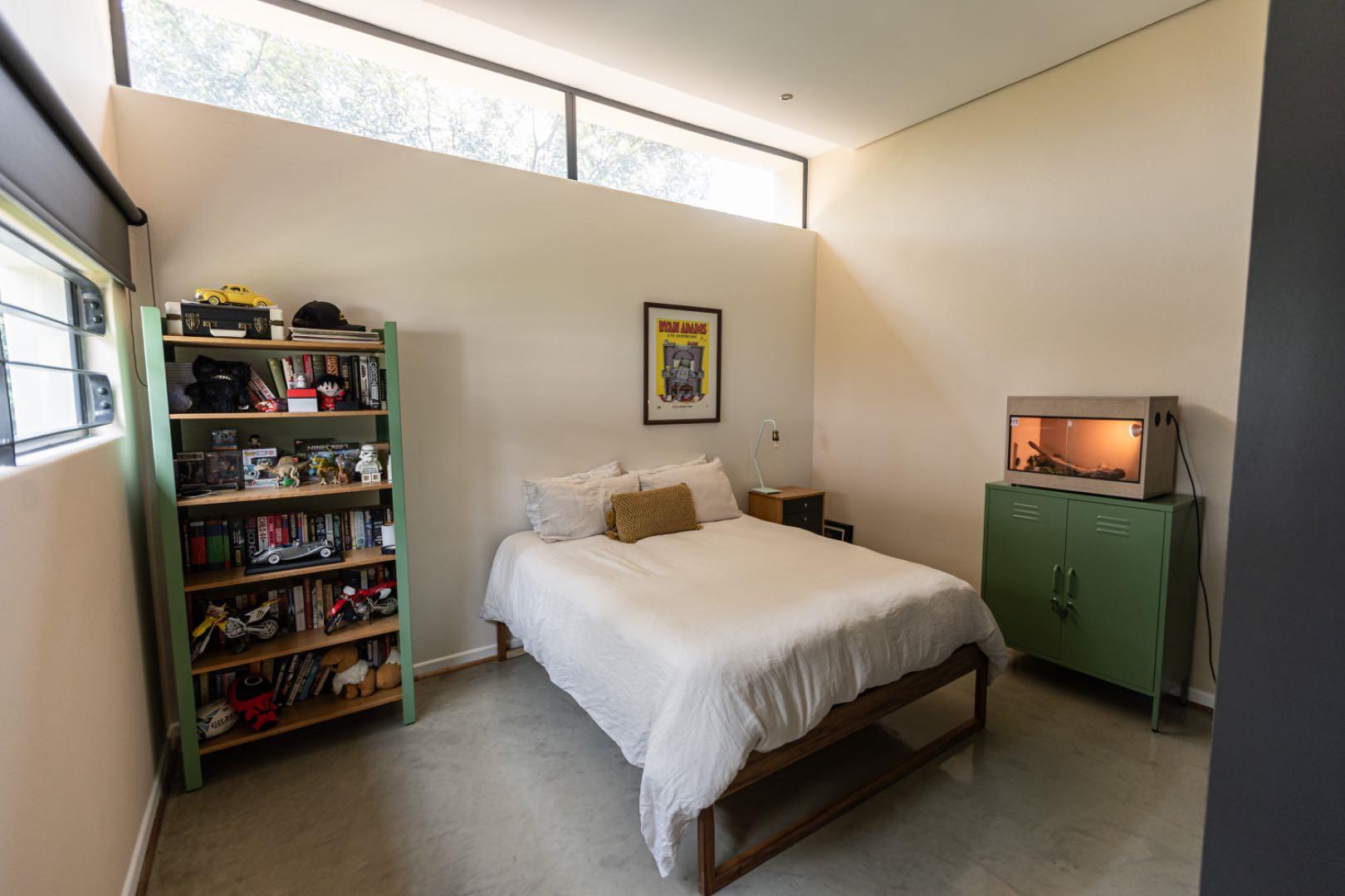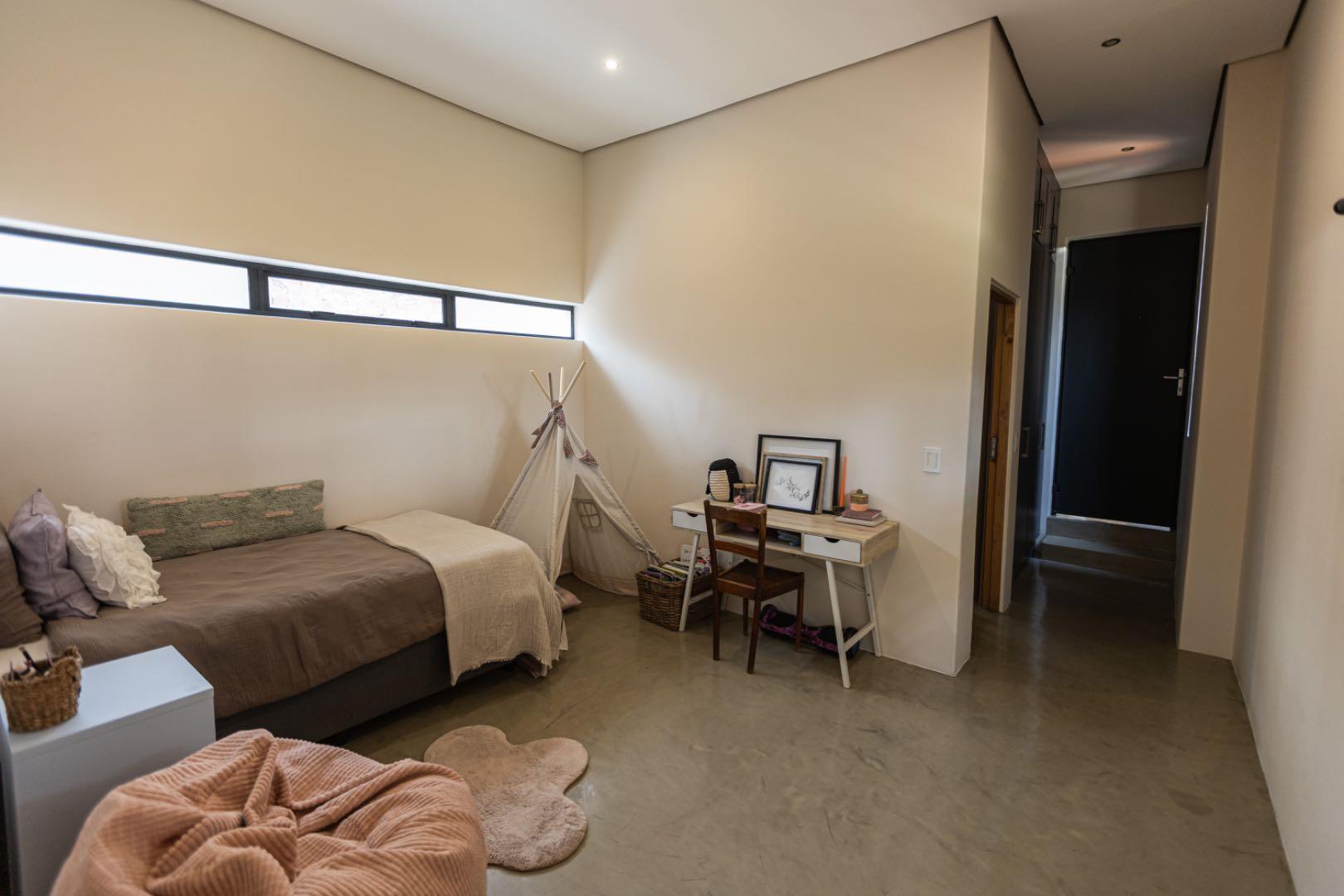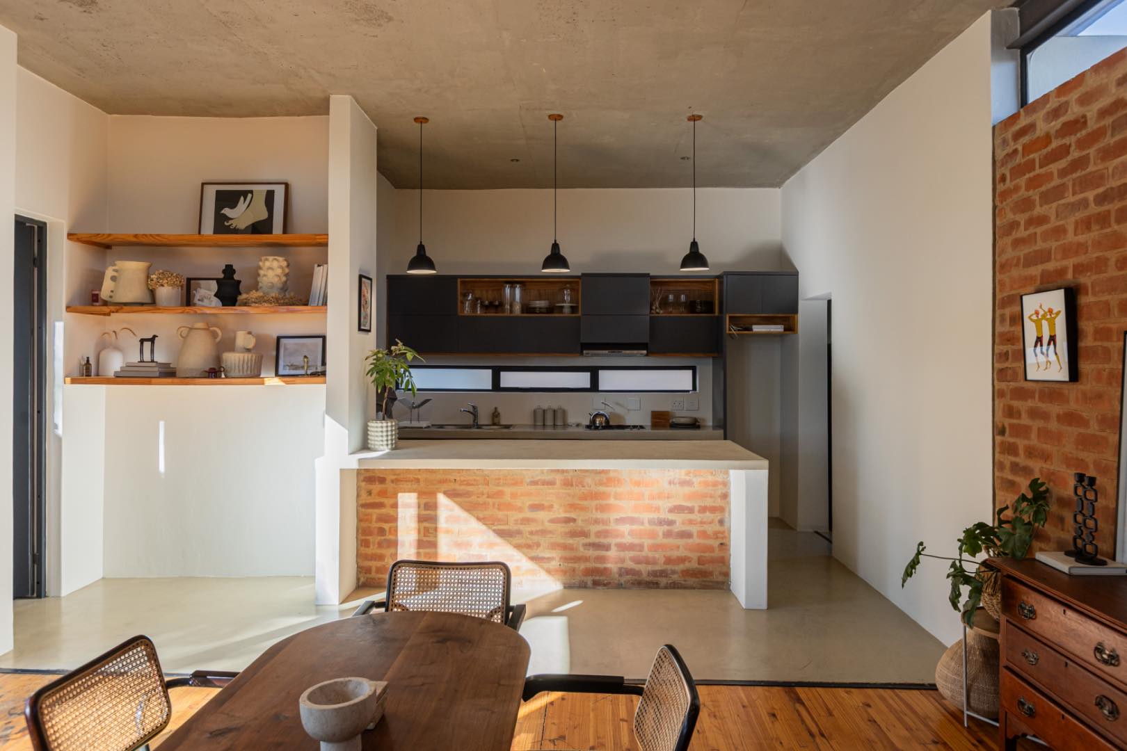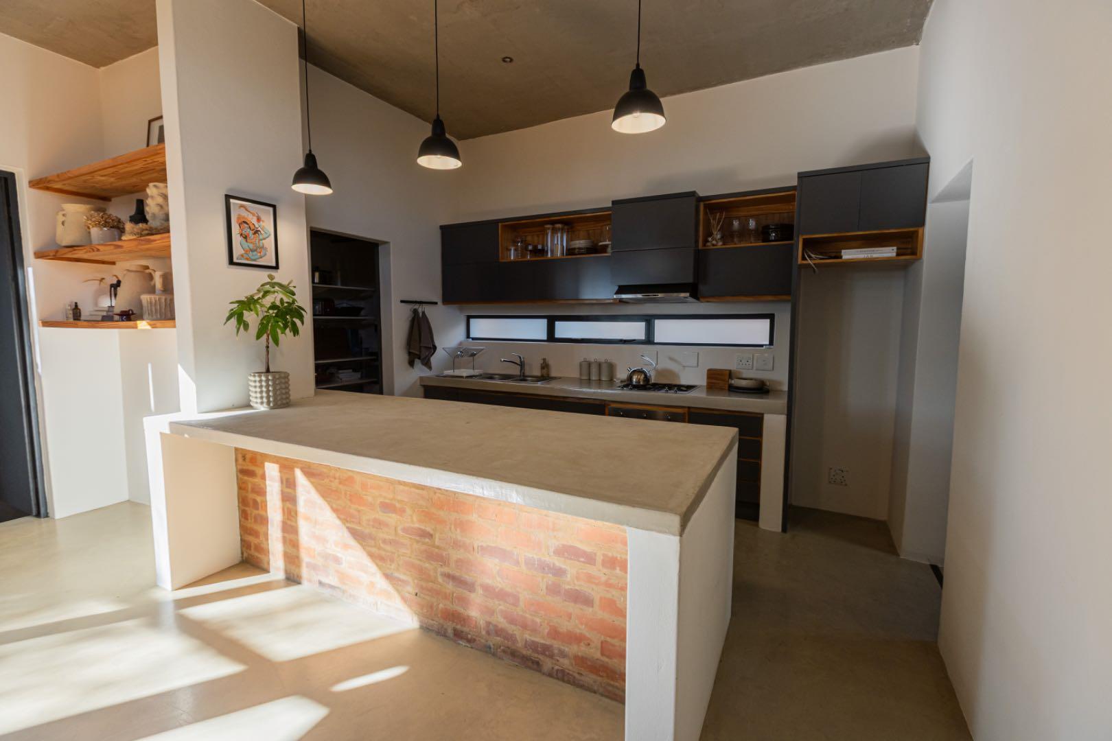 The home features a sleek, open-plan kitchen fitted with a Smeg gas oven, pantry, and a separate laundry area. Flowing seamlessly from the kitchen, the spacious lounge and dining area boast a striking industrial aesthetic with concrete ceilings, exposed brick walls, and a stylish mix of polyurethane screed and wooden flooring.